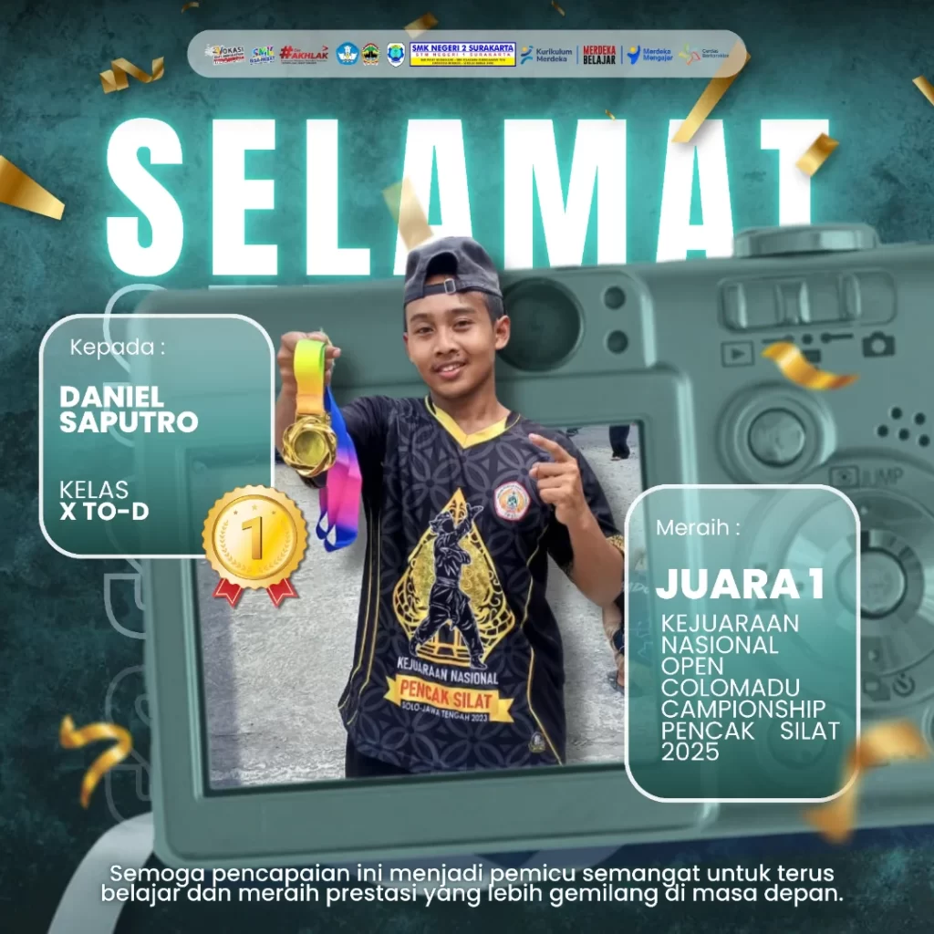 Selamat kepada Daniel Saputro kelas X TOD atas usaha dan kerja keras nya mampu meraih Juara 1 Kejuaraan Nasional open Colomadu Championship Pencak Silat 2025