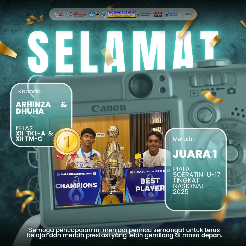 Selamat kepada Arhinza Aldriano Mahendra XII TKL A dan Dhuha Al Fauzi XII TM C atas usaha dan kerja keras nya mampu meraih Juara 1 Piala Soeratin U-17 Tingkat Nasional 2025